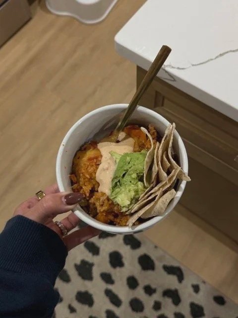 Once the rice is cooked, stir the cottage cheese queso directly into the crockpot until evenly combined. OR you can keep seaparte and top your bowls with it to control portion sizing.